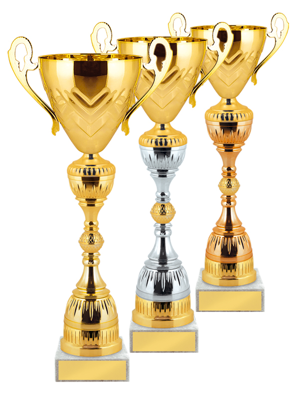 Комплект из 3-х кубков с металлическими чашами на мраморных основаниях.Высота кубков: 40, 45, 47,5 см.